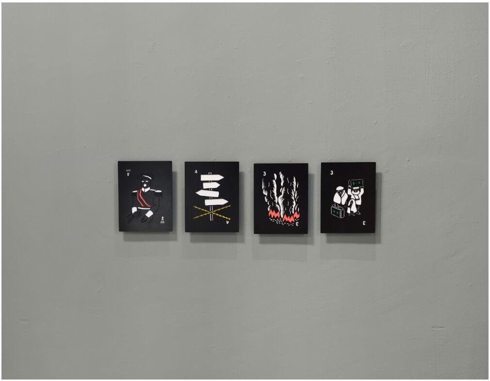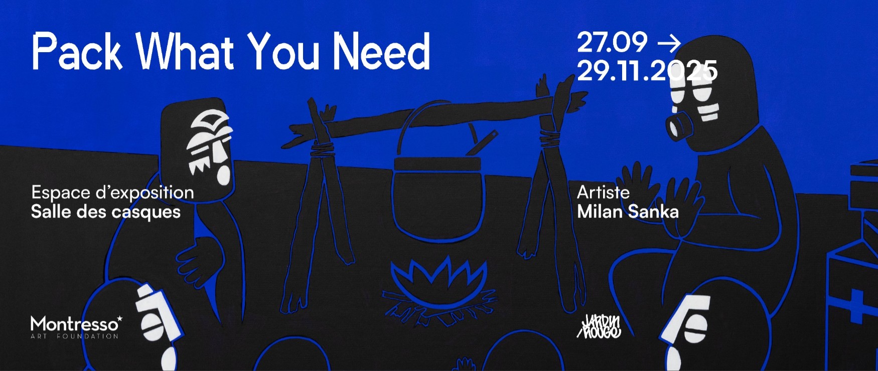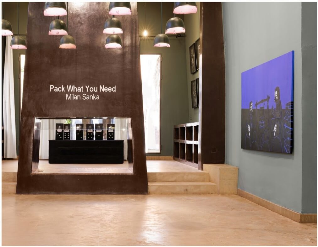 Sur de grands aplats aux couleurs unifiées, se dressent les strates culturelles de l’individu. Par un langage graphique minimal, l’artiste tend vers l’épure sans jamais sacrifier la densité du sens. Son geste, précis, conserve la vivacité du tracé à main levée, oscillant entre spontanéité et vectorisation. Les lignes illuminent et cernent avec précision, les empreintes de l’oubli. Les trajectoires migratoires s’y révèlent dans un nuancier de couleurs aux résonnances symboliques. Dans cette dissonance féconde, Milan Sanka devient le point de jonction vivant de ces parcours antagonistes ; la palette chromatique traduit en creux la convergence de ces destins, dans un ailleurs, devenu horizon commun. Les jeux y émergent comme vecteur de souvenirs et de transmission.