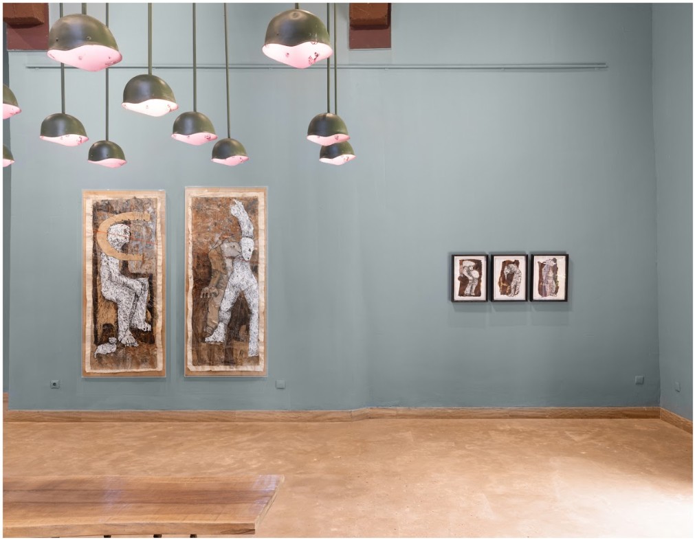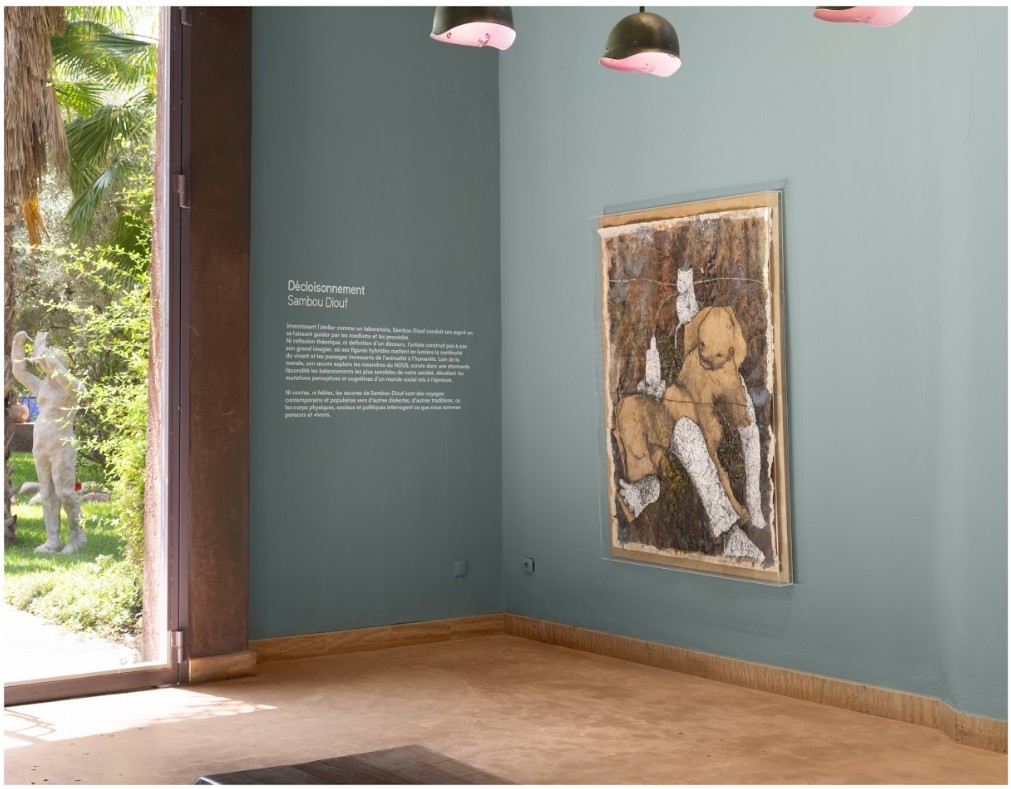 Jardin Rouge est aussi un autre atelier qu’il affectionne, les matériaux sont aussi multiples qu’insolites –emballages, papiers, plastiques...–, l’artiste utilise les moindres aspérités de ses supports pour insuffler sa matière. Sur des sortes de patrons de couture, le brou de noix, les pastels, les pigments naturels sont les outils qui donnent naissance à ses formes, pour être ensuite réassemblées. L’artiste nous offre de prodigieux palimpsestes où le regardeur ressent l’urgence de s’ouvrir à d’autres dehors. La chose n’est sans doute pas nouvelle, mais la comédie humaine décrite, délivre d’autres résonances, dévoile les mutations perceptives et cognitives d’un monde social mis à l’épreuve. Ni contes, ni fables, les œuvres de Sambou Diouf sont des voyages contemporains et populaires vers d’autres dialectes, d’autres traditions, où les corps physiques, sociaux et politiques interrogent ce que nous sommes, nous pensons et nous vivons.