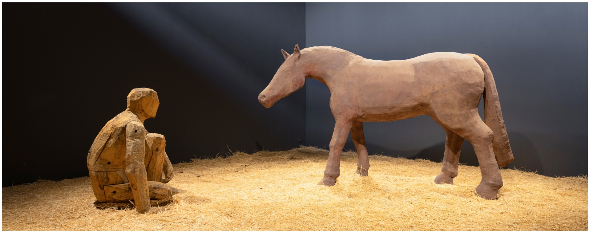 Référence mythologique pour lʼun, tournoiement philosophique pour lʼautre, les interactions de lʼêtre humain avec la nature et les individus sont au cœur des expressions artistiques de ces deux sculpteurs. Dans une analogie platonicienne de la ligne, les formes humaines de Pedro Pires font écho, dans les espaces de la Fondation Montresso, à lʼanimalité des corps des œuvres de Cyrille André.
