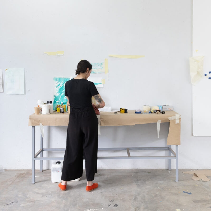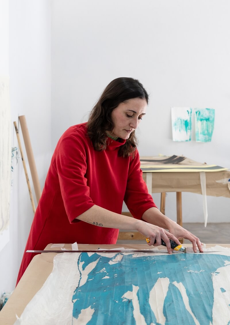En retirant la matière plutôt qu’en l’ajoutant, l’artiste, par des gestes de déchirure, de griffures ou l’utilisation de ruban de masquage vient éliminer progressivement la peinture appliquée sur le papier ou le carton, imprimant une trace indélébile de son processus créatif. Chaque geste, à la fois agressif et libérateur, révèle l’intensité d’un mouvement qui transforme la surface en une empreinte de l’expression humaine. La recherche d’Alba Lorente Hernández, qui se traduit par des dessins et des sculptures abstraites, devient le reflet d’une exploration, un travail sur la mémoire et l’oubli.