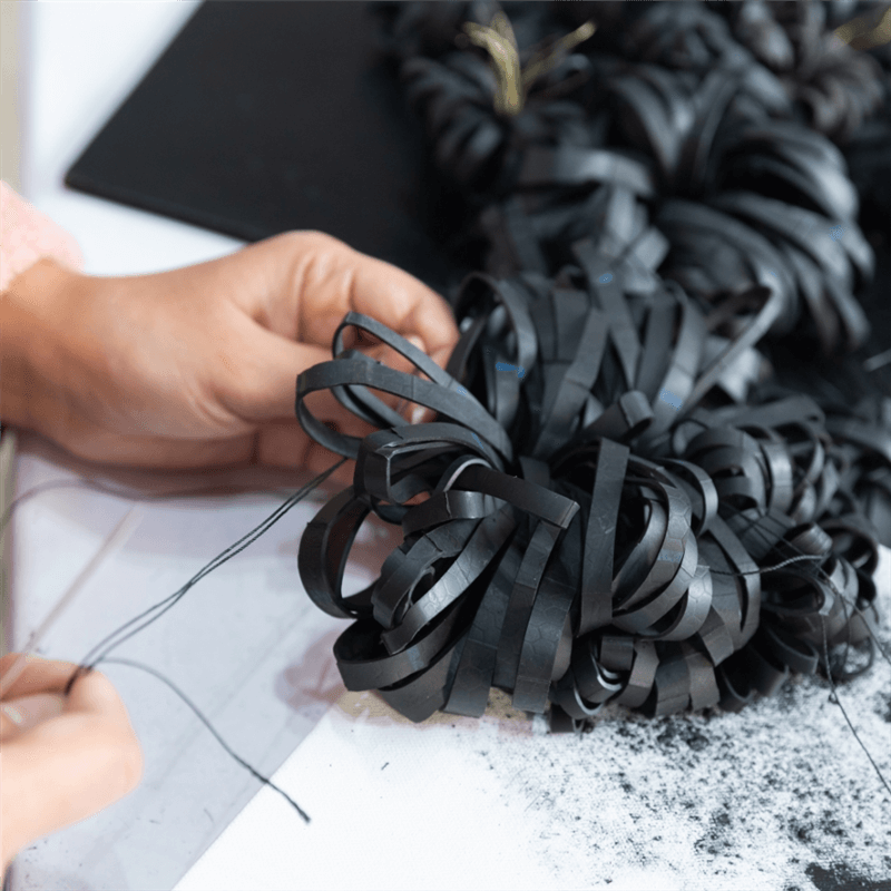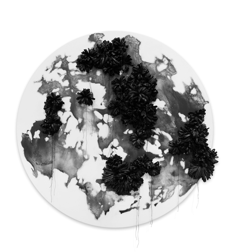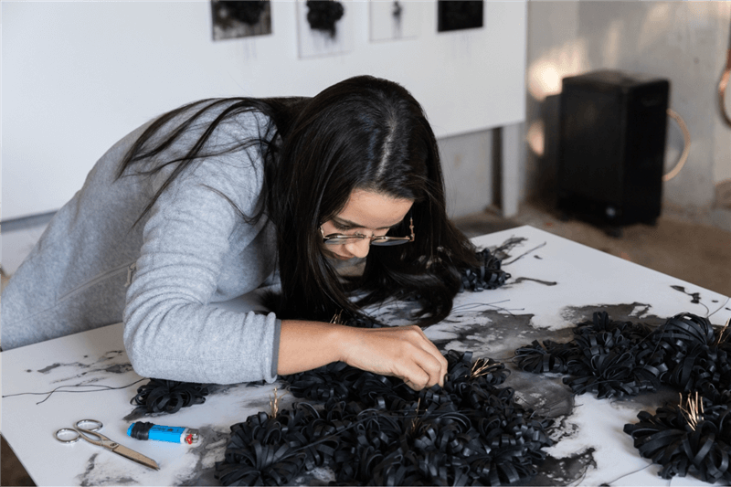 En partant du jeu populaire « Pino » , ou « Pitchak » , pratiqué majoritairement par les garçons, l’artiste interroge la séparation sociale et familiale des genres depuis le plus jeune âge. Revisitant la distribution des attributs féminins et masculins, elle s’engage dans une création ambivalente où ressentis et images mentales se croisent et se recomposent. Renversement esthétique des aprioris, l’objet emblématique du caoutchouc y devient la base de formes florales qui éclosent sur les différents supports. Entre figuration et matière, le fil de cuivre intègre ces compositions en symbolisant un flux continu d’énergies en quête d’équilibre.
