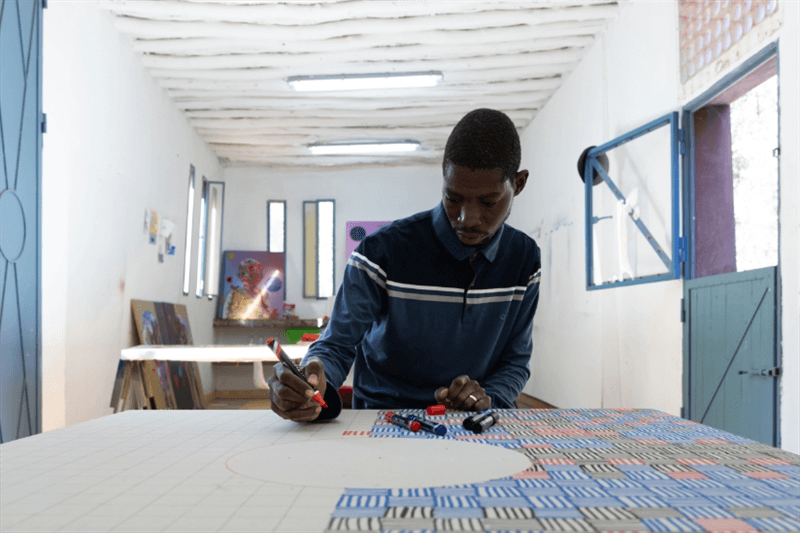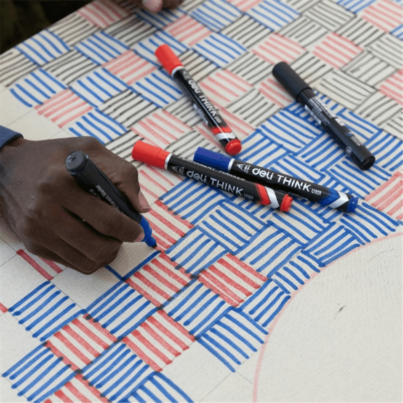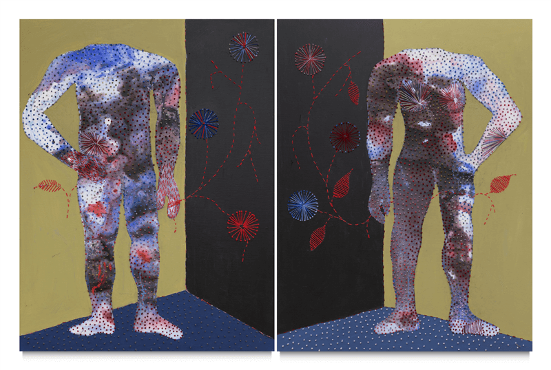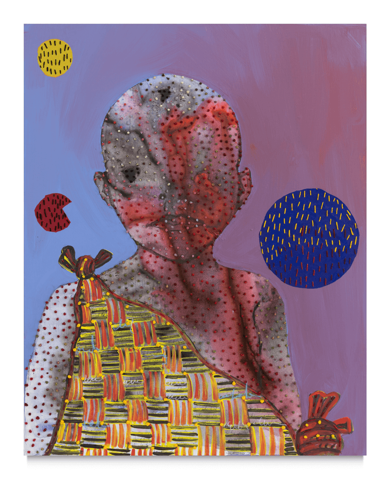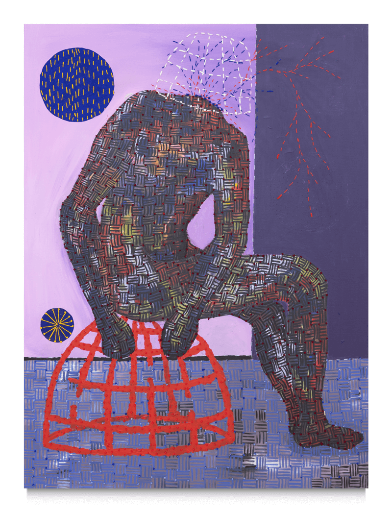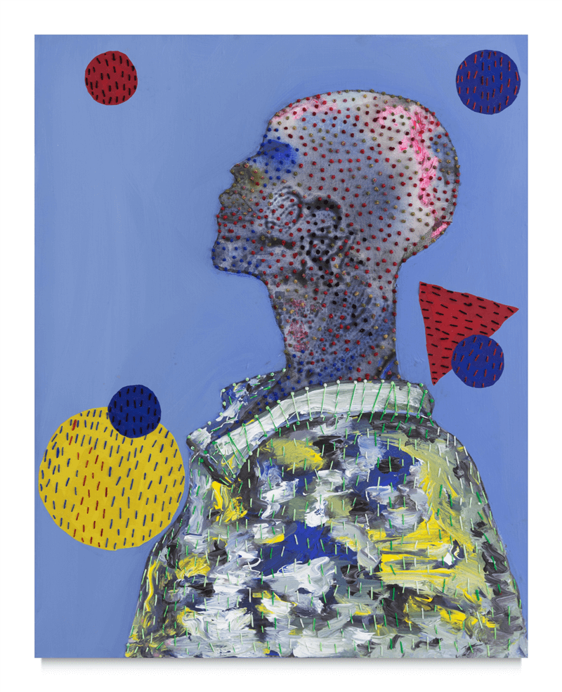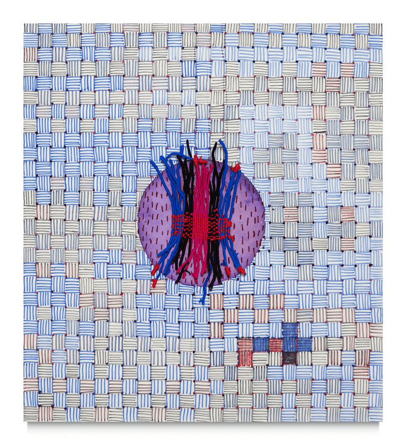 Le travail du tissage traditionnel est la clé de voûte de la création d’Ibrahim Ballo, les nœuds comme héritage familial, point de rattachement aux femmes de sa région rurale, Sikasso au Mali. Un matrimoine relevant les enjeux économiques, sociaux mais aussi d’indépendance et de liberté, résonnant avec nos propres modernités par une pratique contemporaine ancrée dans les traditions. Fil conducteur de sa vie et de son art, Ibrahim Ballo, par une multitude de points de jonction, nous parle de lui, en les observant elles. Tisser des liens, entre modernité et tradition, entre les individus, c’est toute une réflexion esthétique qu’Ibrahim Ballo nous livre par la broderie de fil de coton sur sa peinture acrylique.