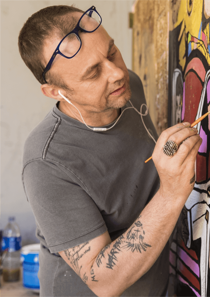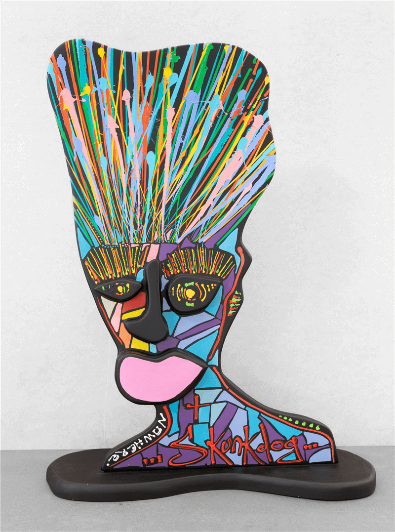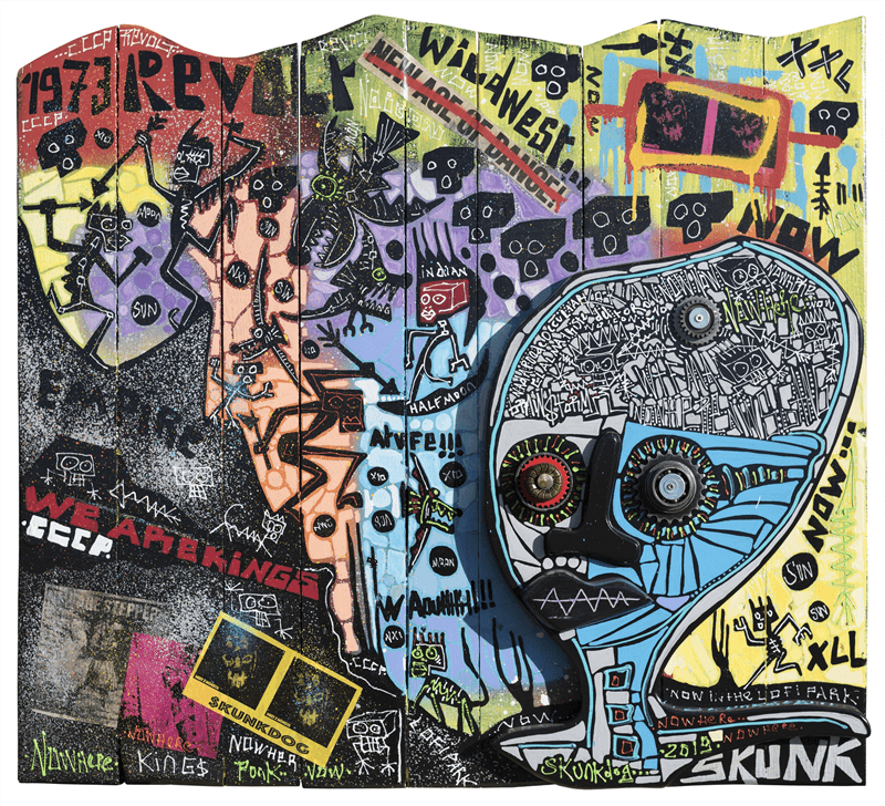 Artiste autodidacte, c’est l’attention au monde entourant qui fait de Skunkdog un véritable témoin de son temps. Volontiers hors normes, sa quête d’objectivité cohabite joyeusement avec une pensée empreinte de culture punk et des codes de la rue.