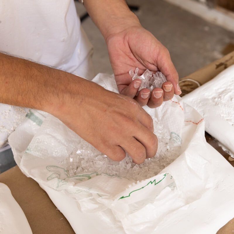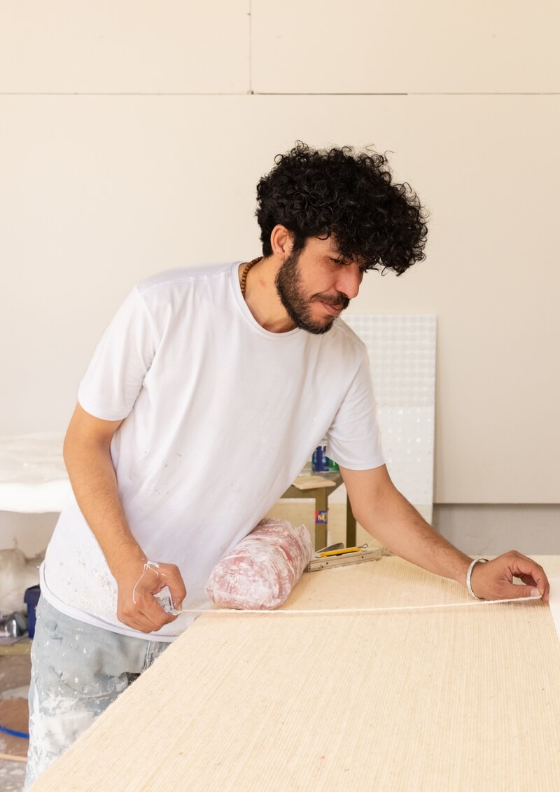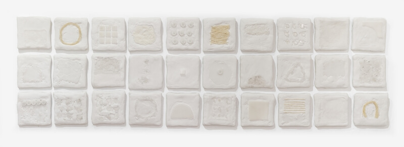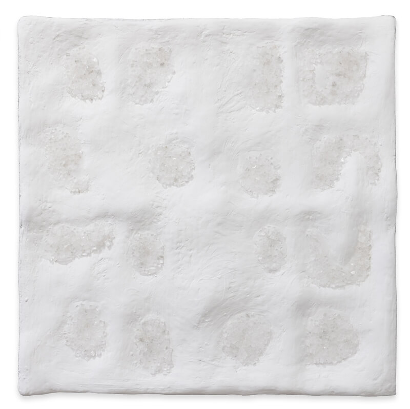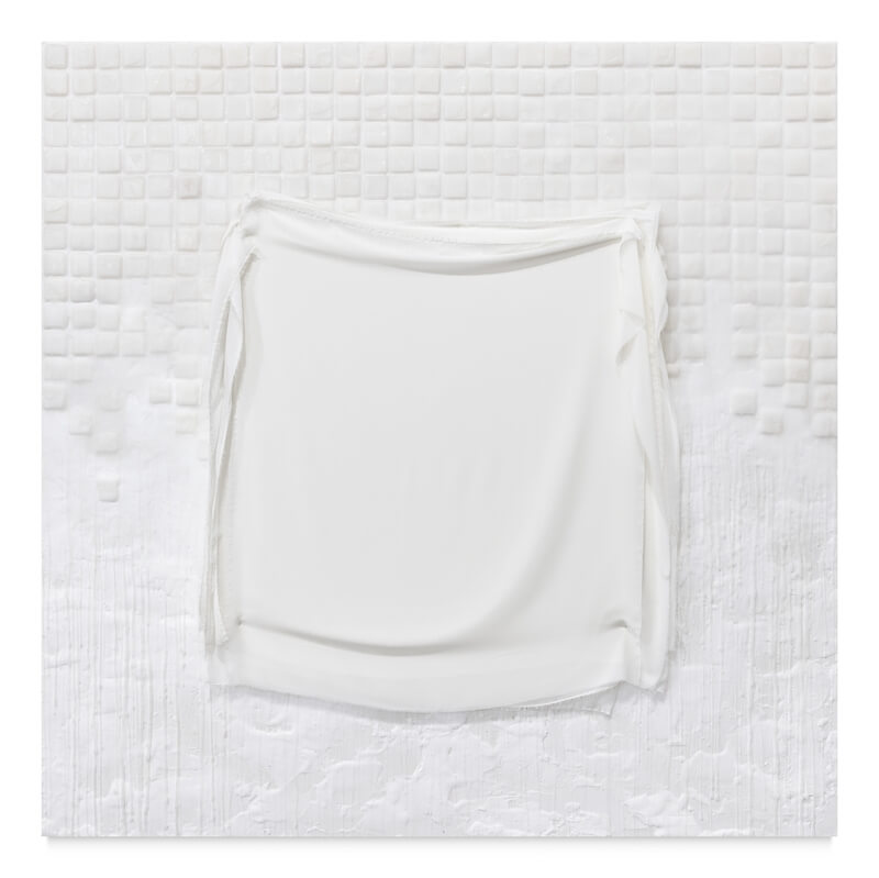 Dans le silence apparent du blanc, Youssef Elmekaoui, lauréat de l’Institut National des Beaux-Arts de Tétouan et professeur des Arts appliqués à Rabat, explore une mémoire sensible façonnée par les lieux de culte de son enfance. Son travail, depuis 2011, prend forme dans la peinture en explorant des matériaux issus des mausolées et sanctuaires soufis — sucre, sel, pierre d’alun. Originellement transparents, ces éléments deviennent les écrins d’une mémoire impalpable.